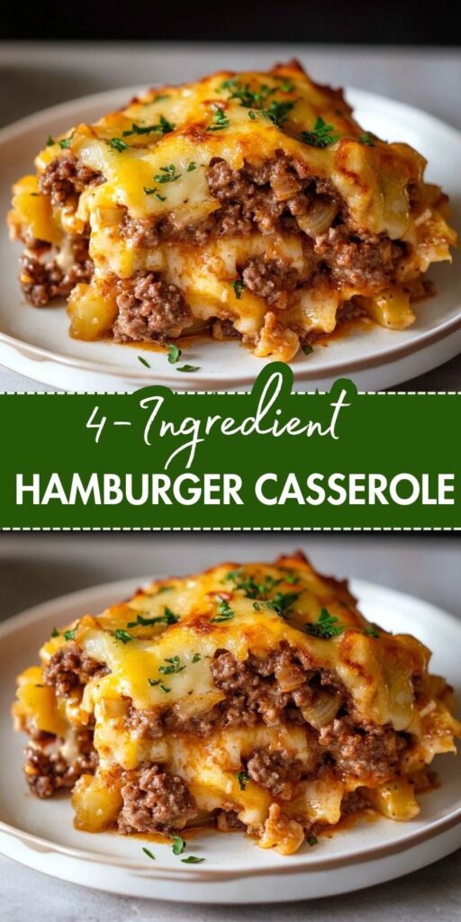 This casserole is also highly adaptable. You can customize it with different types of cheese, toss in vegetables for added nutrition, or even sprinkle some breadcrumbs on top for extra texture. Easy to prepare, budget-friendly, and irresistibly comforting, the 4-Ingredient Hamburger Casserole is a recipe that will become a quick favorite for busy nights and hungry appetites.