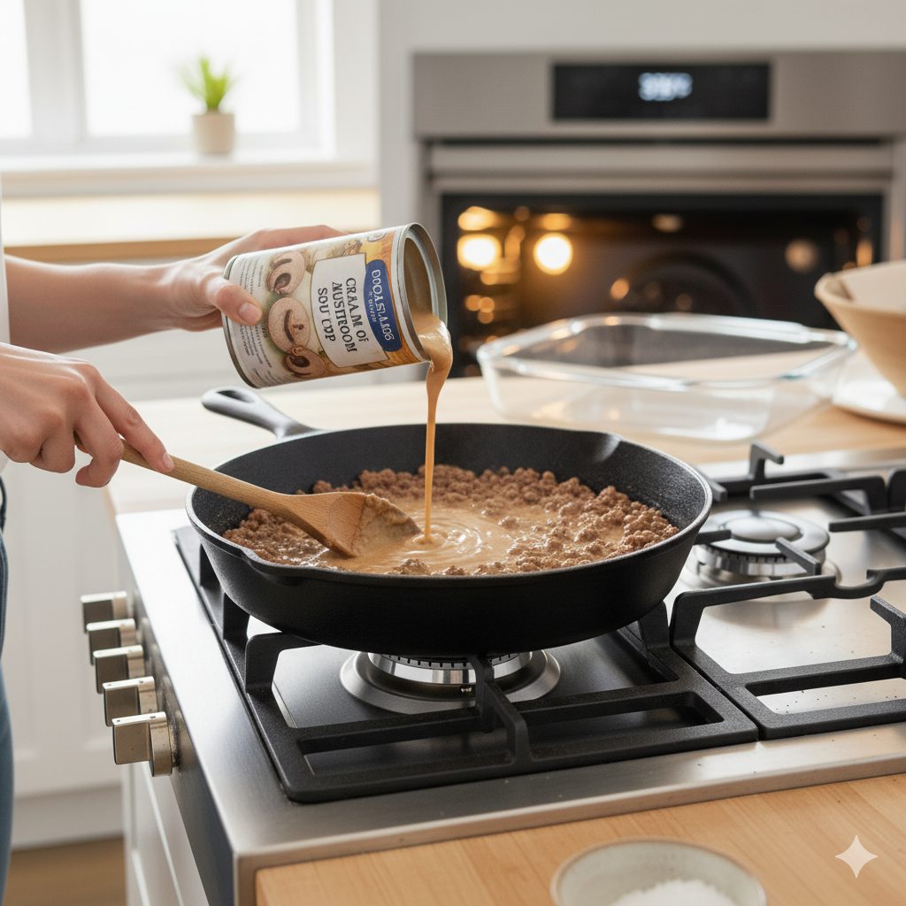 A small pinch of salt and black pepper goes a long way. These little additions boost the natural flavors of the beef and cream of mushroom base, ensuring the casserole doesn’t fall flat.