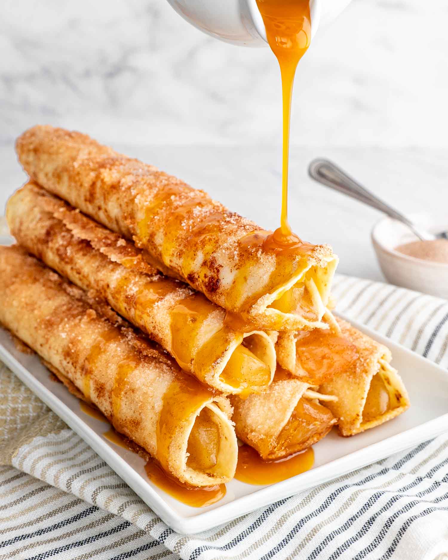 2. While the taquitos are still warm (but not too hot), roll or sprinkle them in the cinnamon sugar mixture until well coated.
