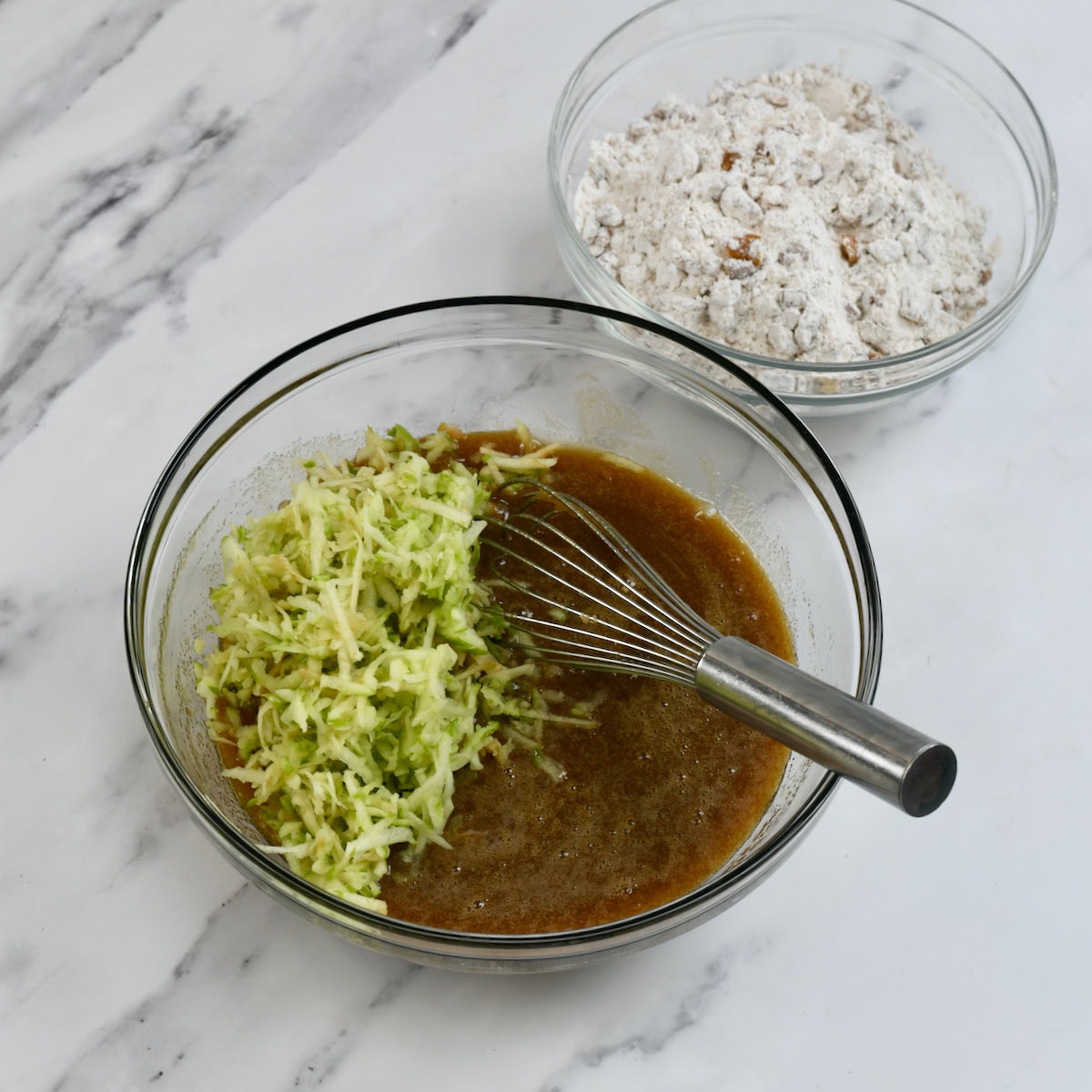 Gradually add the dry ingredients to the wet mixture, mixing until just combined.