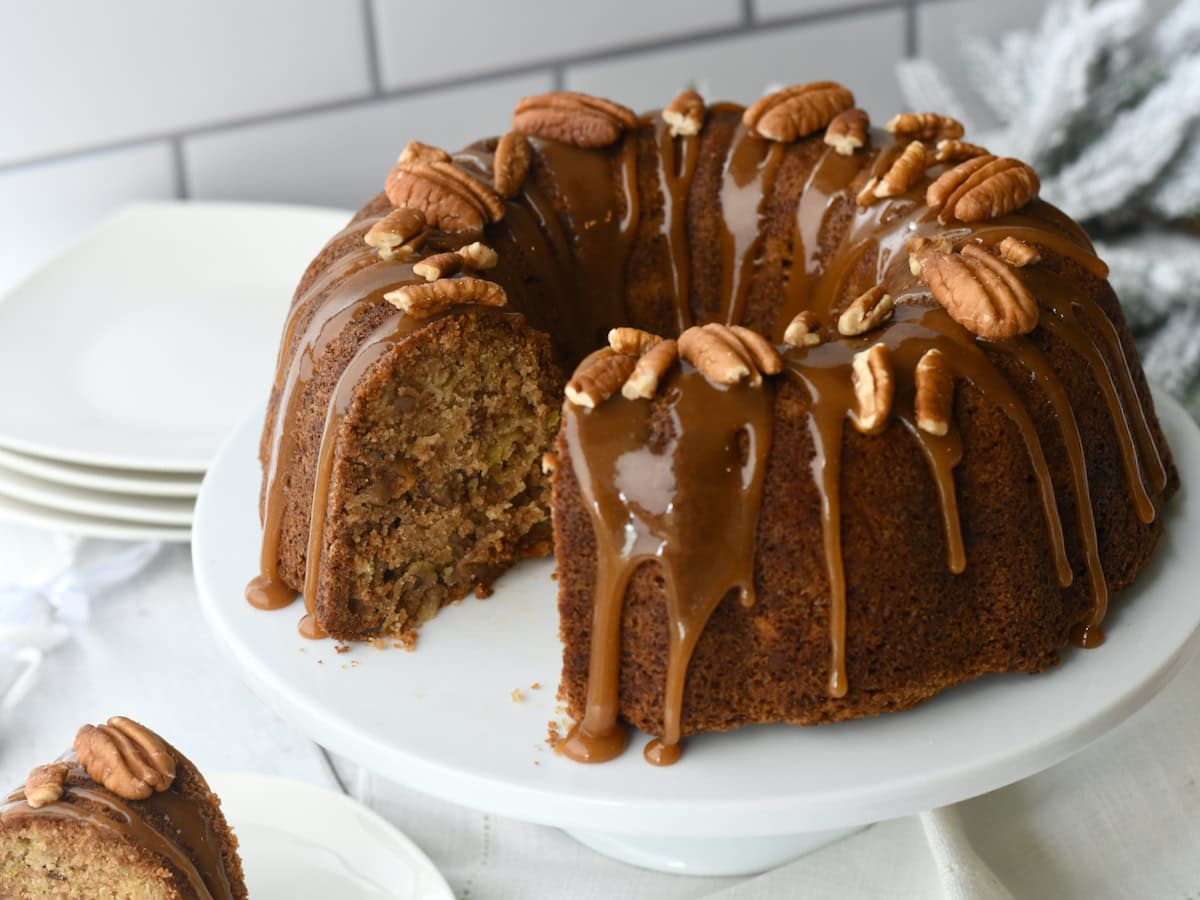Whether served warm with a scoop of vanilla ice cream or enjoyed with a cup of coffee, Apple Pecan Cake with Caramel Glaze is a true crowd-pleaser!