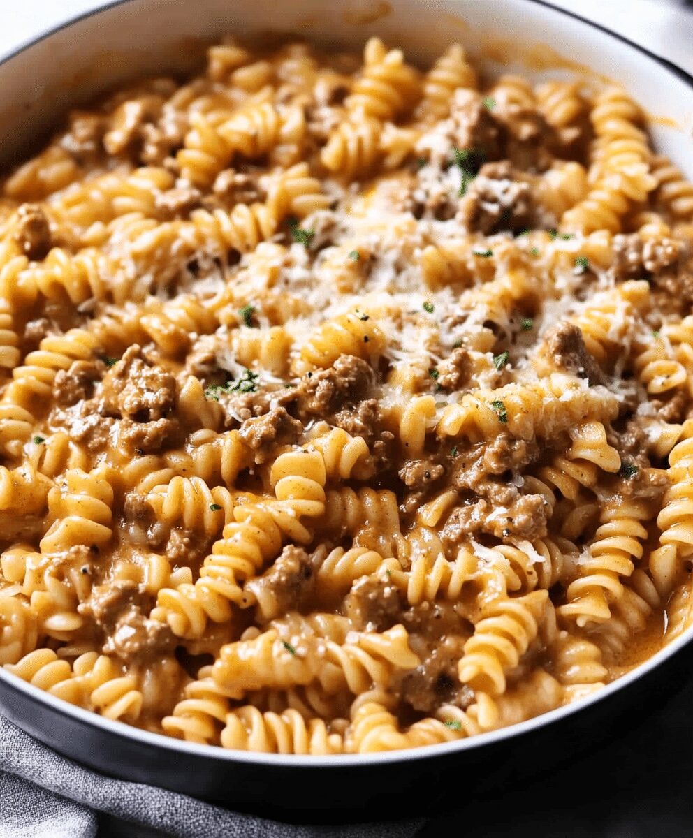 Beef and Rotini in Garlic Parmesan Sauce is a hearty, flavorful pasta dish featuring tender ground beef, al dente rotini, and a rich, creamy garlic Parmesan sauce.