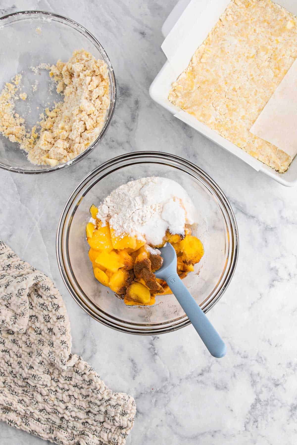 In another bowl, toss the peaches with sugar, cornstarch, vanilla, cinnamon, and lemon juice. The cornstarch will help thicken the juices as the peaches bake, preventing a soggy crust. Spread the peach mixture evenly over the crust.