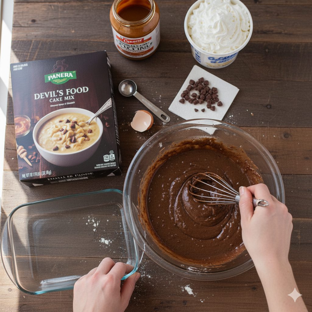 Preheat your oven to the temperature specified on your chocolate cake mix box, or set it to 350∘F. Follow the cake mix directions precisely, combining the mix with the required water, oil, and eggs in a large bowl. Ensure the batter is smooth and lump-free. Pour this mixture into a prepared 9×13-inch baking dish (sprayed with non-stick coating) and bake for the directed time, or until a thin skewer inserted into the center emerges clean. Remove the cake from the oven and let it stand for 10 minutes.