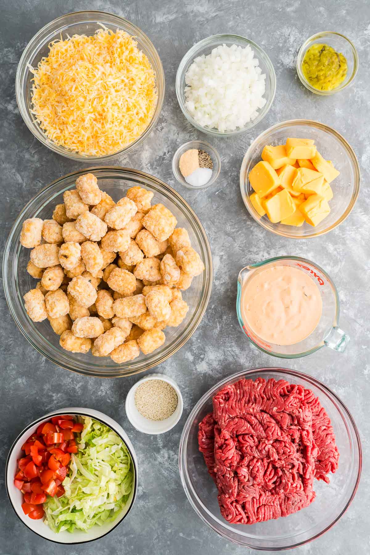 It usually includes seasoned ground beef, chopped pickles, onions, Thousand Island-style sauce, shredded cheddar cheese, and crispy tater tots baked on top.