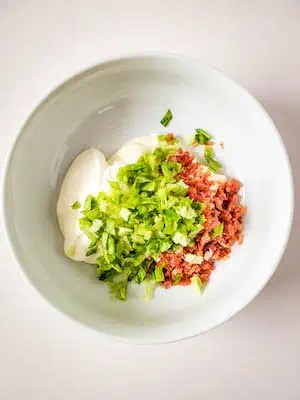 To keep the ingredients together and add richness, mix mayonnaise, sour cream, or cream cheese with seasonings like garlic powder, black pepper, and a squeeze of lemon juice.