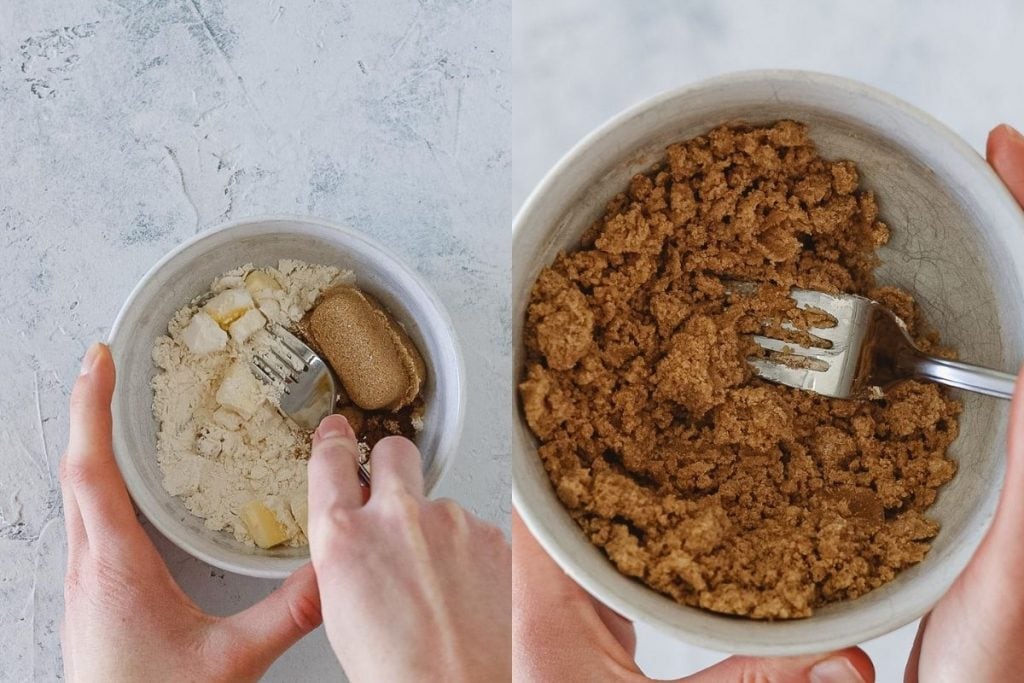 In a small bowl, mix flour, brown sugar, and cinnamon. Cut in butter until crumbly. Chill in fridge.