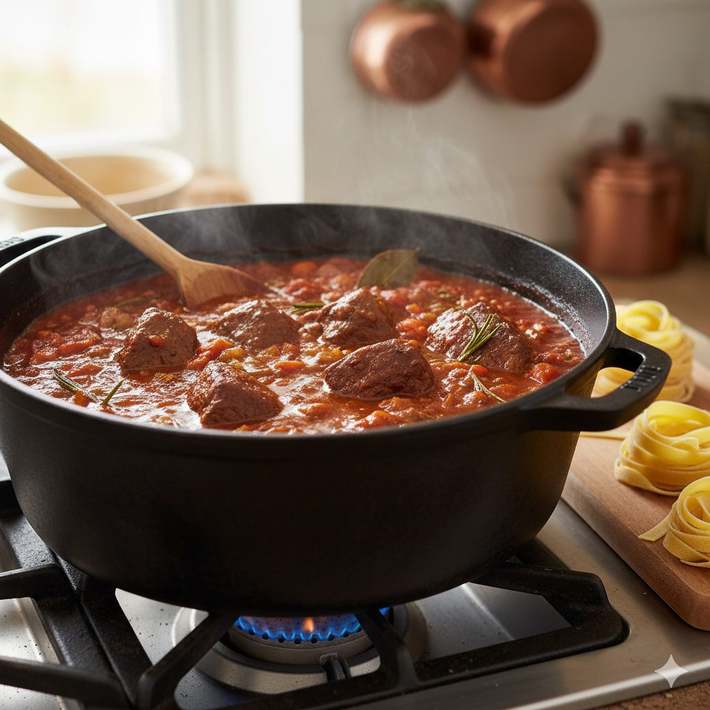 - The Simmer: Once the liquids (crushed tomatoes and beef stock) are added, the magic happens. The ragù should be barely bubbling—a very slow, gentle simmer.