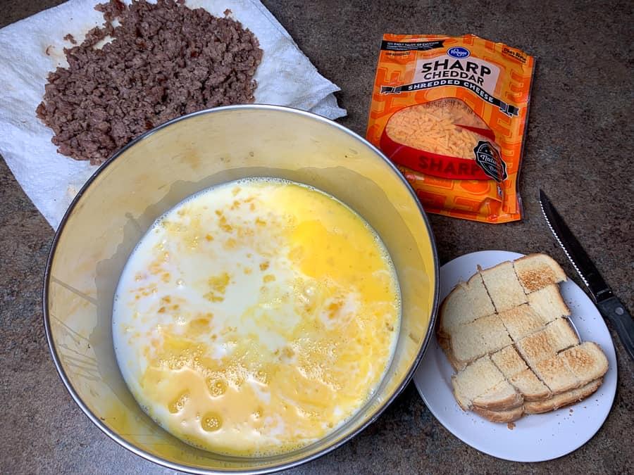 In a bowl, whisk together eggs, milk, salt, and pepper. Pour over the sausage and bread.