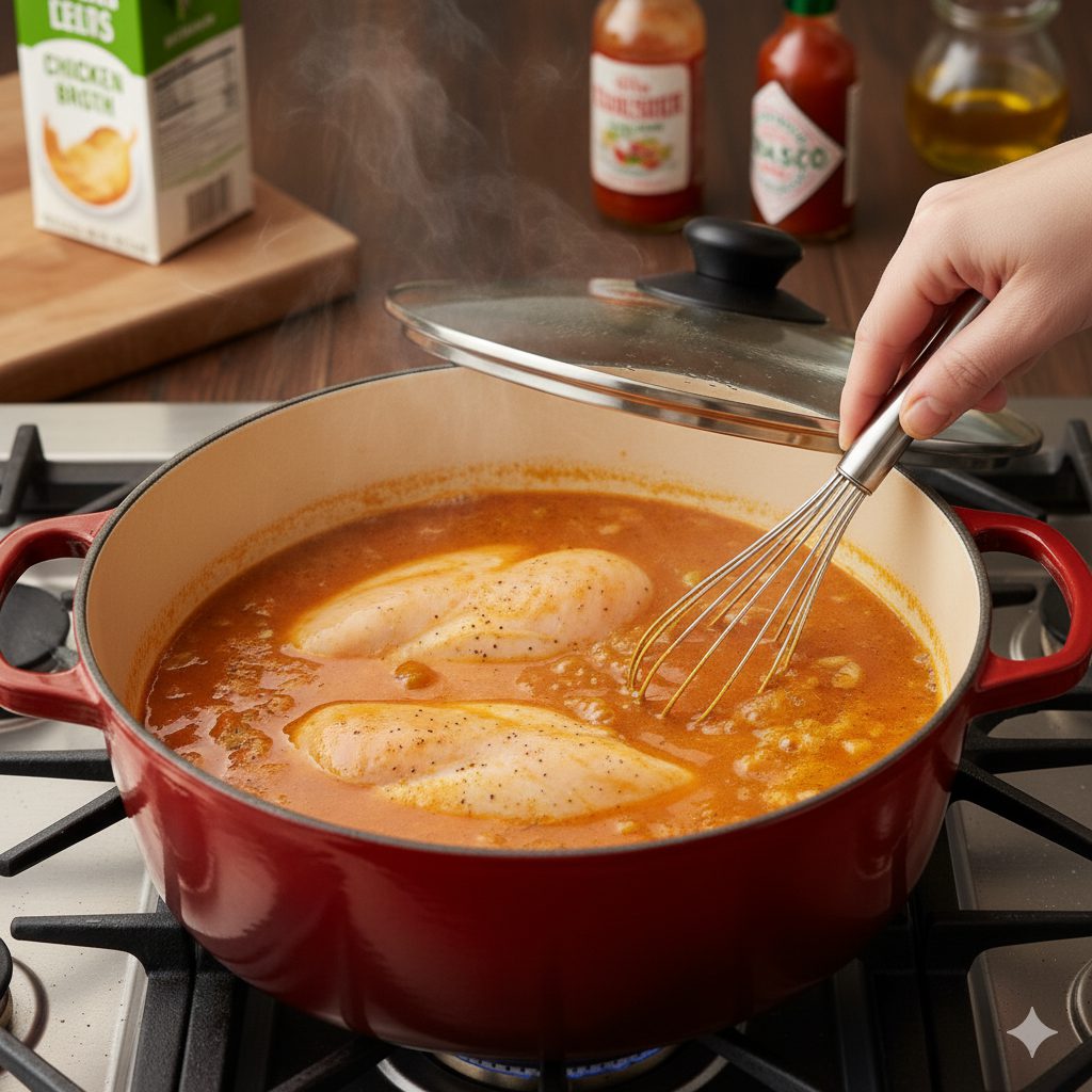 Slowly introduce the chicken broth into the pot, whisking continually to create a smooth soup base without lumps. Stir in the hot sauce and black pepper. Submerge the chicken breasts completely in the simmering liquid. Raise the heat until the soup reaches a gentle, rolling boil, then swiftly reduce the heat to maintain a subtle, slow simmer. Cover the pot loosely and let the chicken cook for 15 to 20 minutes (165∘F).