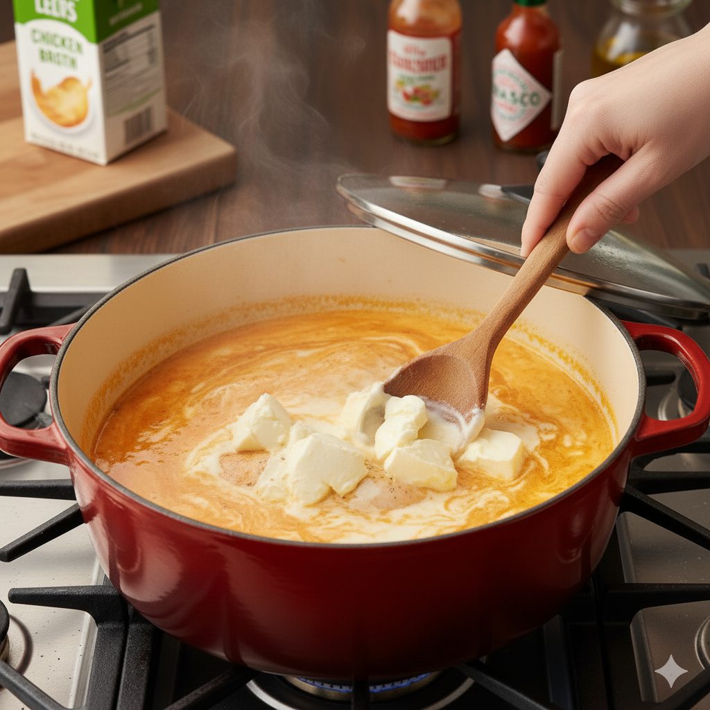 Into this bubbling broth, fork-shredded, succulent chicken is folded. The magic truly happens with the final swirl of cream cheese, which tames the heat into a luscious, buttery warmth without surrendering any of its famous, aggressive tang.