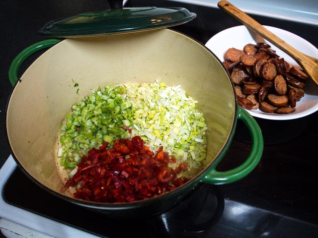 In a large soup pot or Dutch oven, heat the butter and olive oil over medium heat. Add the diced onion, green bell pepper, and celery. Sauté for 5–7 minutes, until the vegetables are soft and the onion is translucent. Stir in the garlic and cook for another 30 seconds until fragrant.