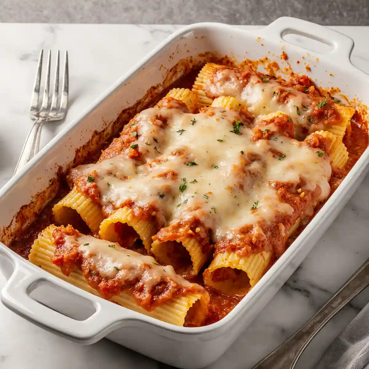 Cheese-Stuffed Manicotti is a comforting Italian-American pasta dish featuring tender manicotti tubes generously filled with a rich blend of ricotta, mozzarella, and Parmesan cheeses.