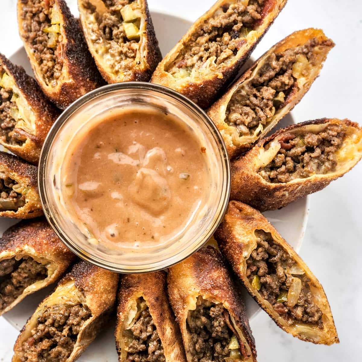 These savory delights are filled with seasoned ground beef, melted cheese, onions, and pickles, all wrapped in a crunchy egg roll wrapper.