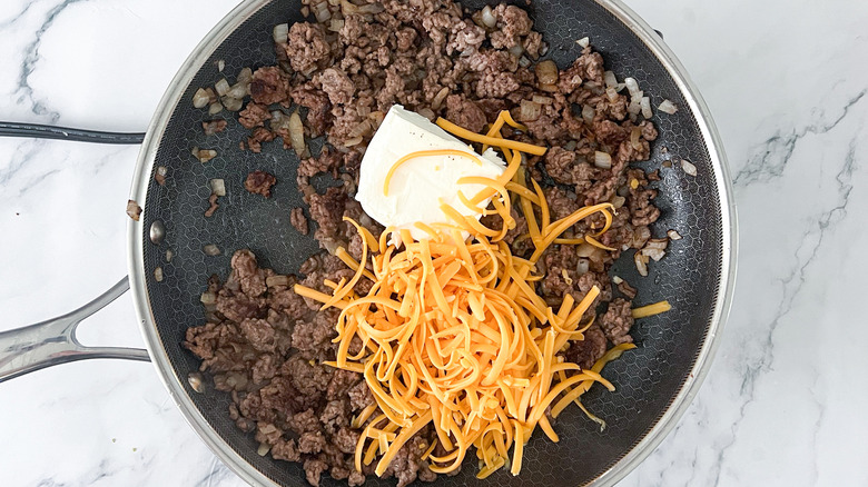Mix shredded cheddar and diced pickles into the cooled beef mixture.