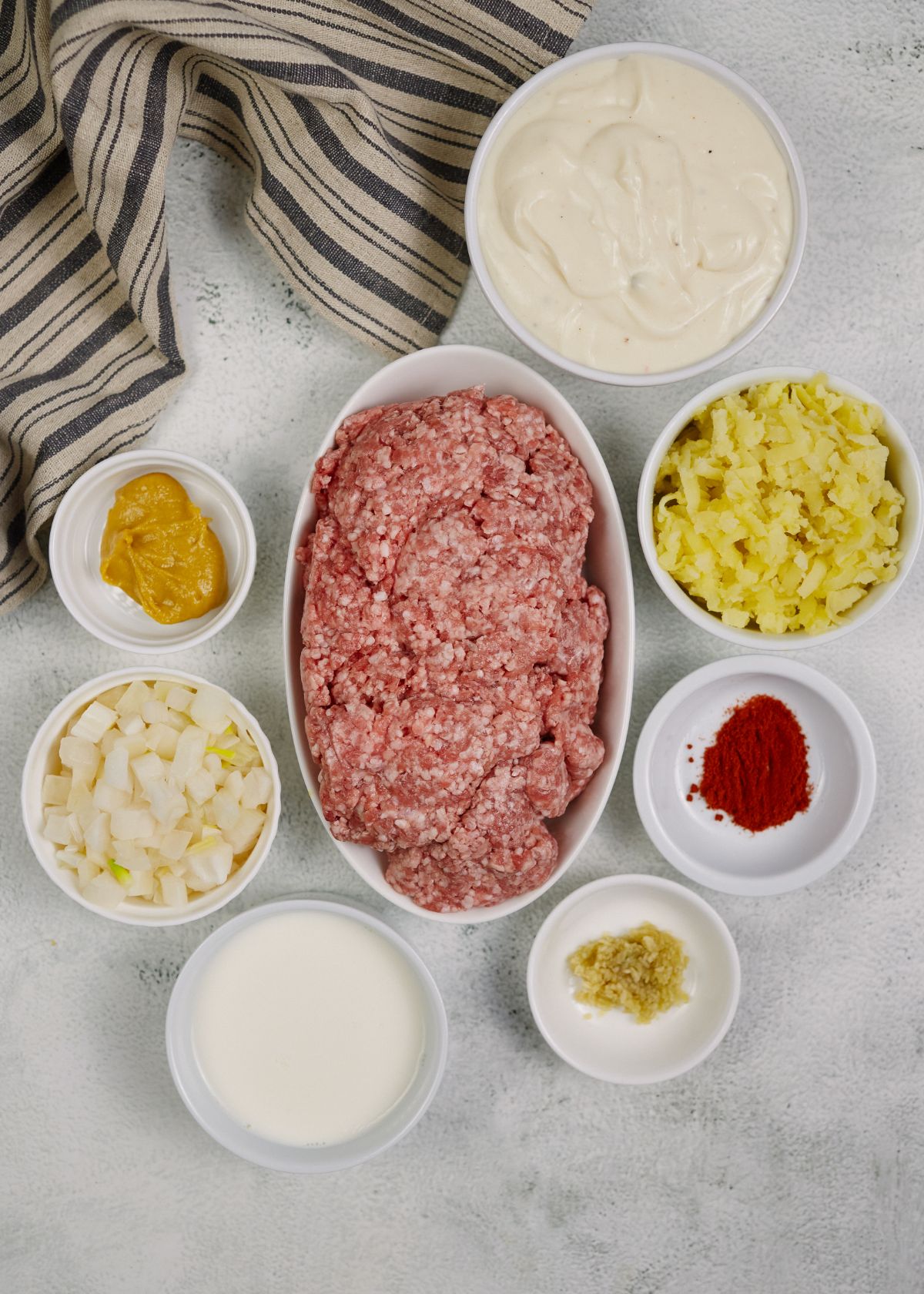 Ground beef is cooked with onions and seasoning, then layered between thinly sliced potatoes and smothered in a creamy cheese sauce.