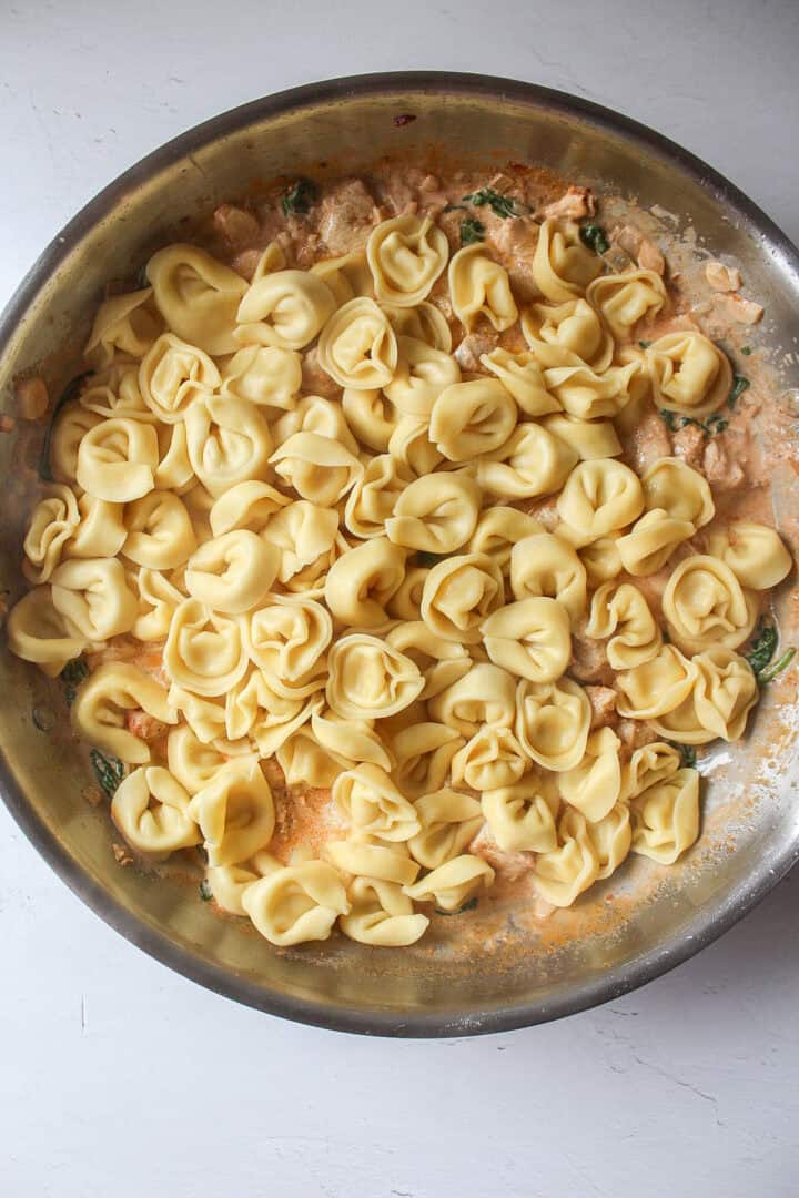 • Cook the chicken in the same pan as the sauce to absorb all the delicious flavors. Adding the tortellini directly to the sauce also minimizes cleanup.