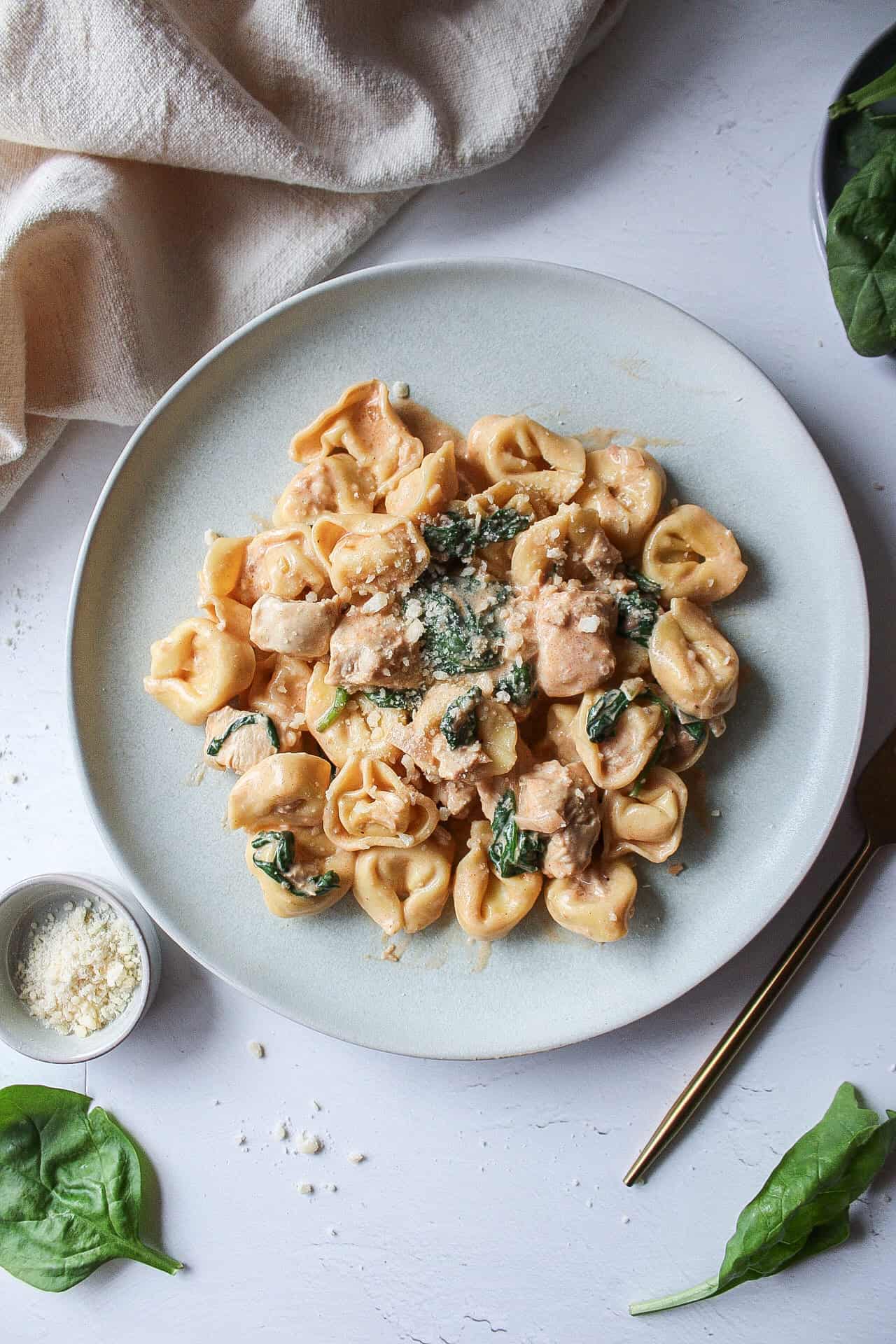 • Prepare the sauce and chicken ahead of time. Store them separately in the fridge and reheat gently before mixing with cooked tortellini.