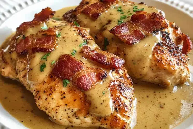Return chicken and bacon to the pan and coat with sauce. Simmer another 2–3 minutes.