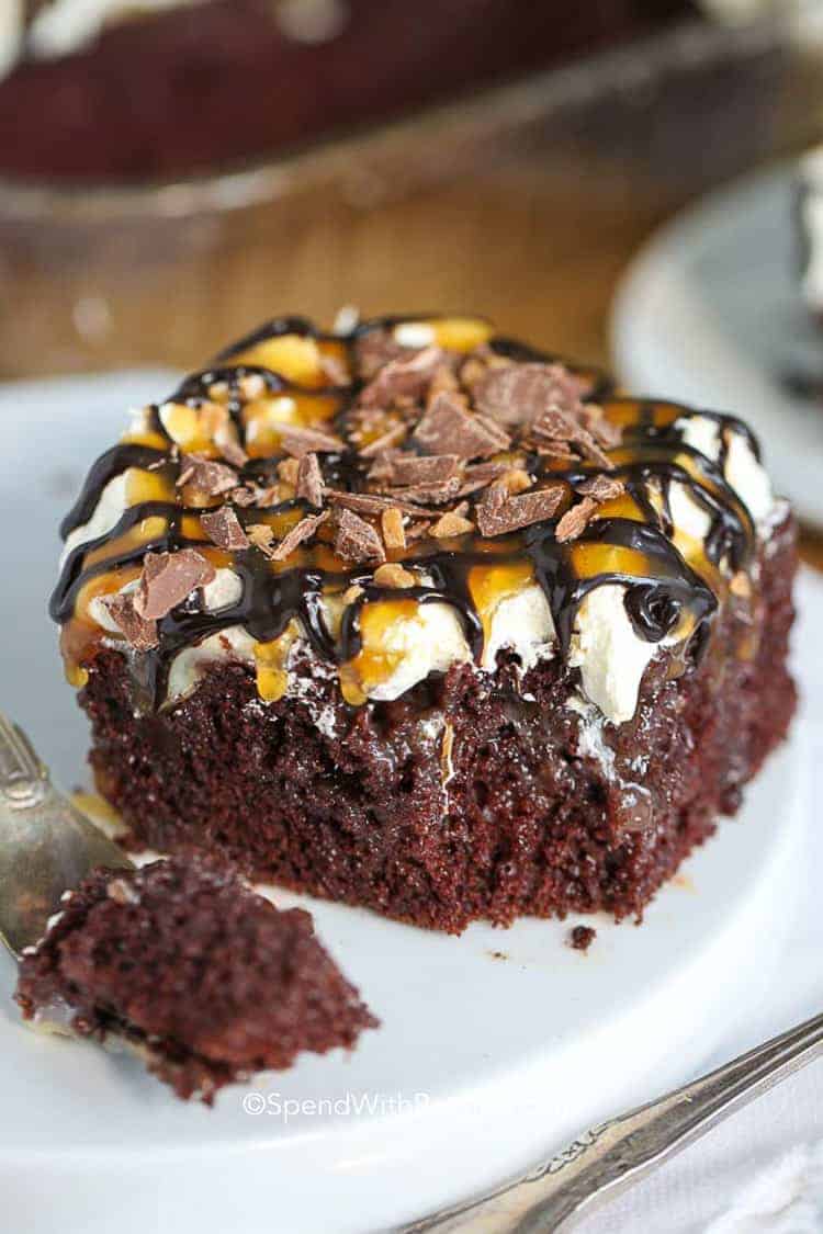 The caramel seeps into the cake, making it extra moist and flavorful. It's often topped with whipped cream or chocolate frosting and garnished with toffee bits, caramel drizzle, or chopped candy bars.