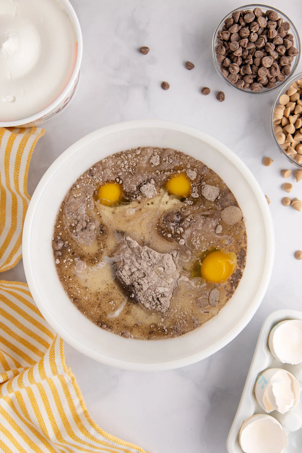 Start by preparing the chocolate cake batter according to the box instructions. Most box mixes require 3 eggs, ½ cup oil, and 1¼ cups water, but always follow the specific instructions on your brand.