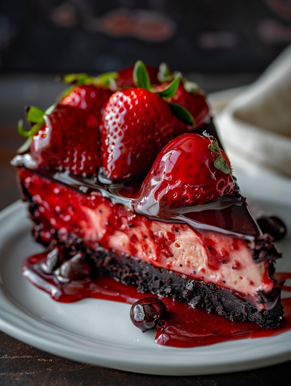 This show-stopping treat features rich, creamy cheesecake infused with the sweet-tart flavor of fresh strawberries, all wrapped in a luscious coating of smooth, melted chocolate. Perfect for special occasions, romantic evenings, or when you simply crave something extraordinary, this dessert combines the classic charm of chocolate-dipped strawberries with the luxurious texture of cheesecake.