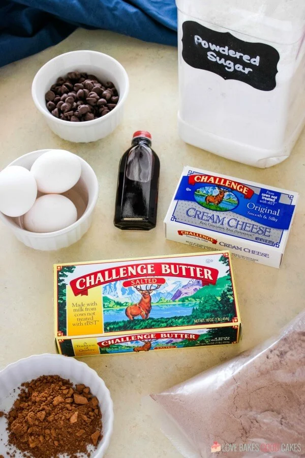 The cake usually starts with a moist chocolate cake base made from scratch or a box mix. The “butter cake” topping is made with cream cheese, butter, powdered sugar, eggs, and vanilla extract, combined until smooth and spread over the baked cake base.