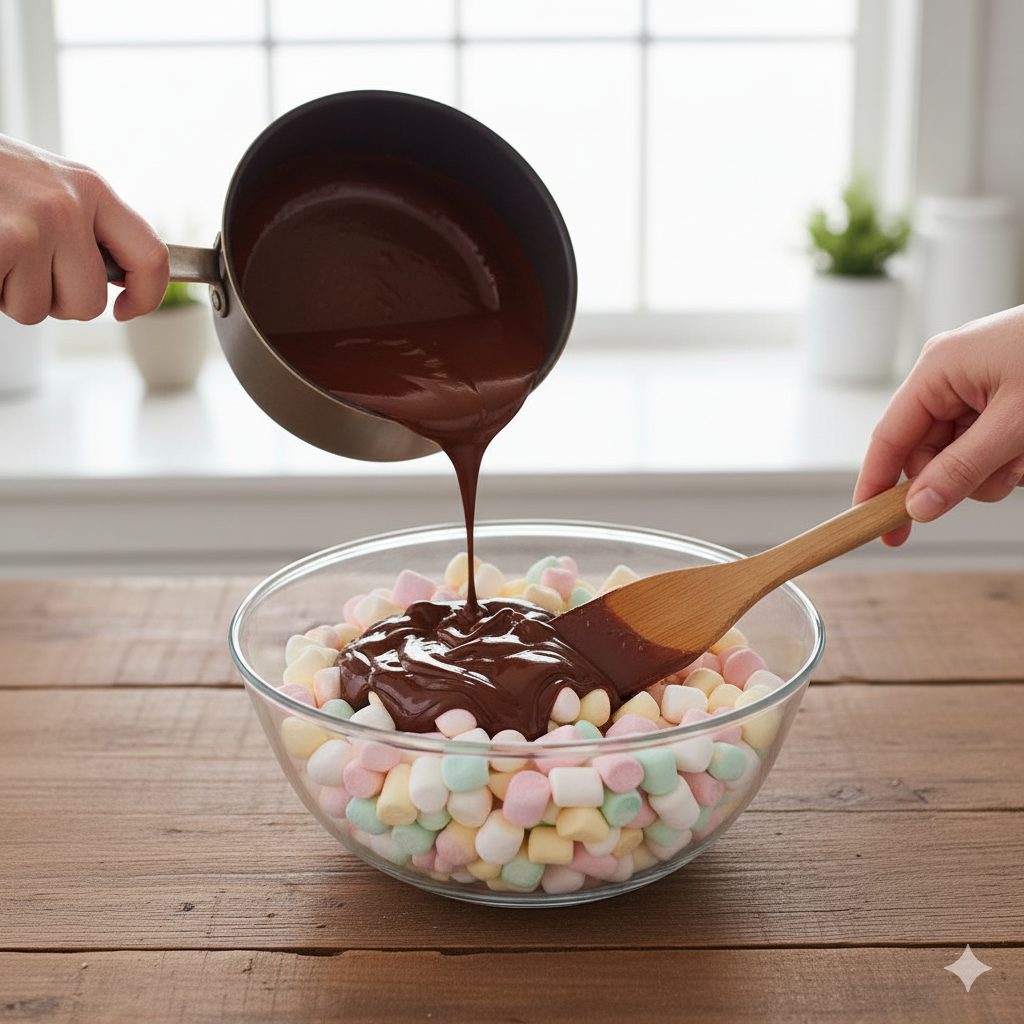 - Trick: Gentle and Quick Folding: Once the slightly cooled chocolate mixture is poured over the marshmallows, fold them in quickly and gently. Over-mixing can break the marshmallows or cause them to melt. The goal is to distribute them evenly with just enough contact to coat them lightly in chocolate.
