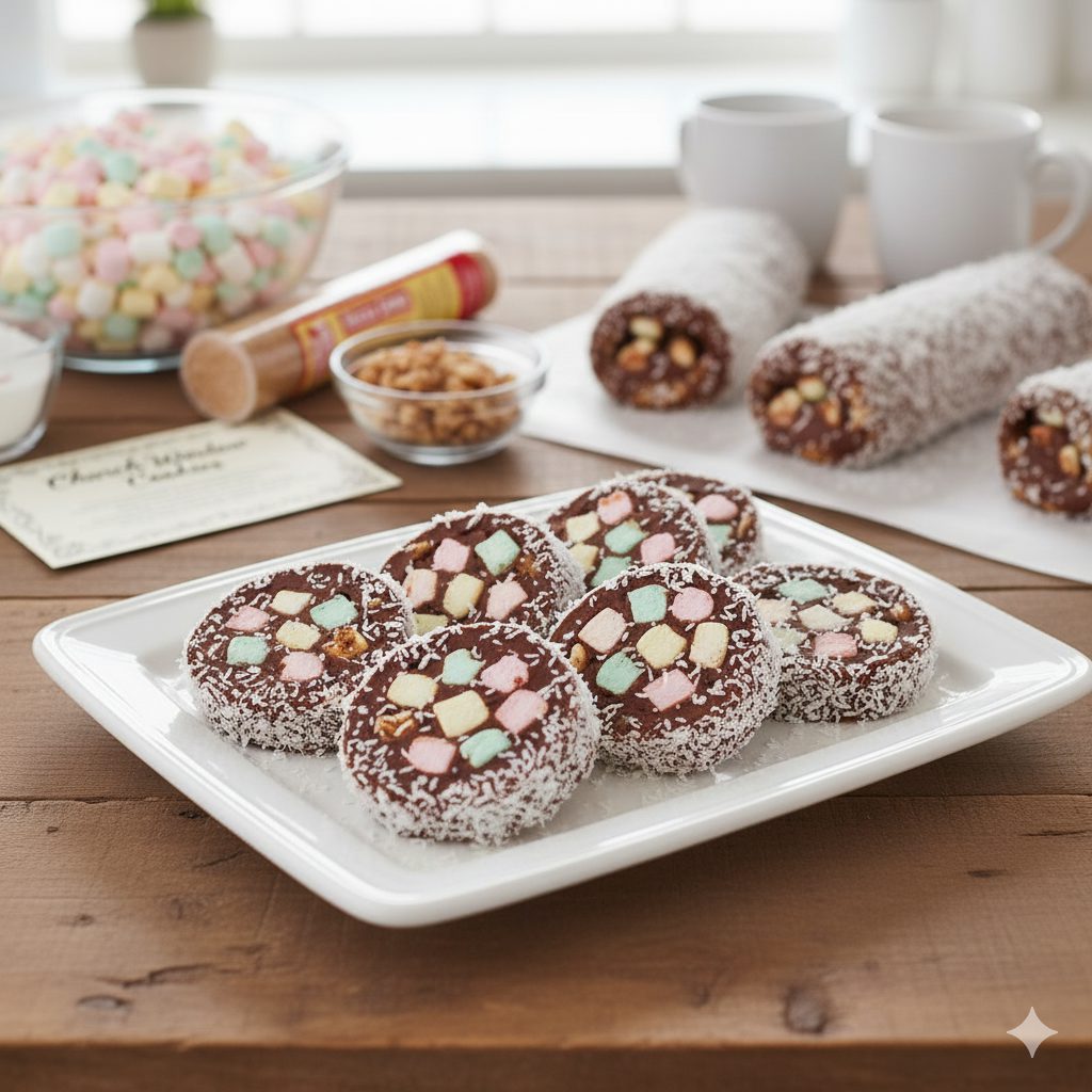 The process is remarkably easy: melted chocolate and butter are blended with a touch of vanilla, then folded around an abundance of bright marshmallows and crunchy walnuts or pecans. Once chilled and sliced, each disk reveals a unique, shimmering pattern.
