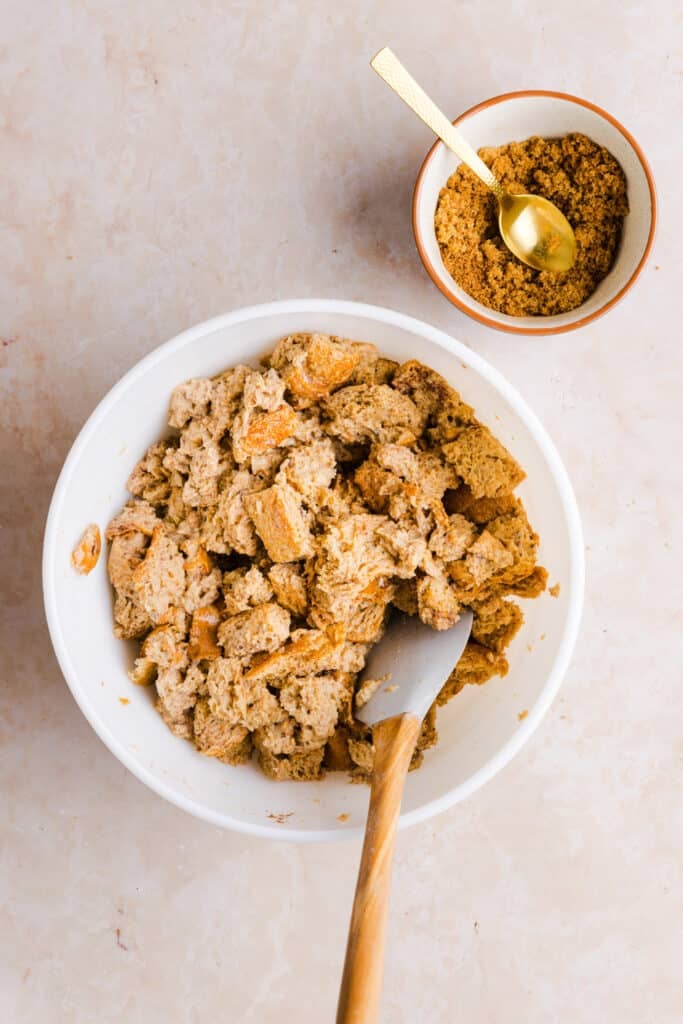 Add bread cubes and stir gently to coat. Let sit for 5 minutes to absorb.