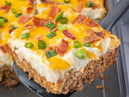 • Make Ahead: Prepare and assemble the meatloaf and mashed potatoes ahead of time. Store covered in the fridge for up to 24 hours before baking. Add cheese and onions before final bake.