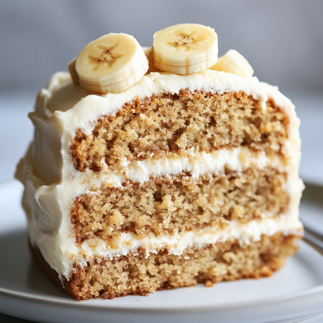 Once the cake is completely cool, remove it from the freezer and frost generously with the cream cheese frosting. You can leave it rustic or spread it smooth for a polished look. Top with chopped nuts (such as walnuts or pecans) or banana slices if desired. Slice into 12–16 squares and serve. This cake stays fresh and moist for days, making it great for make-ahead occasions.