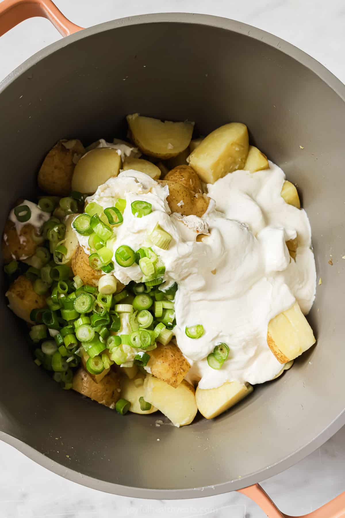 Boil Potatoes: Place potatoes in a large pot, cover with water, and add a pinch of salt. Bring to a boil and cook for 15–20 minutes or until fork-tender.
