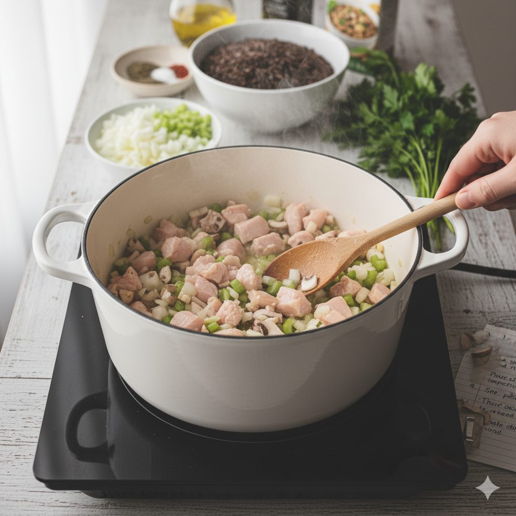 Start the rice cooking separately. In a secondary saucepan, combine 1 measuring cup of dry wild rice (or a mixture containing wild rice) with 4 cups of water and a small amount of salt. Bring the contents to a rapid boil, then decrease the heat and allow it to cook, covered, until the grains are tender (about 45 minutes). In your primary cooking vessel, a large, heavy-bottomed pot or Dutch oven, pour in one tablespoon of olive oil and heat over moderate-high heat. Quickly brown the surfaces of the chicken pieces for approximately two minutes per side; the interior will finish cooking later. Lift the browned chicken from the pot and reserve it on the side. -