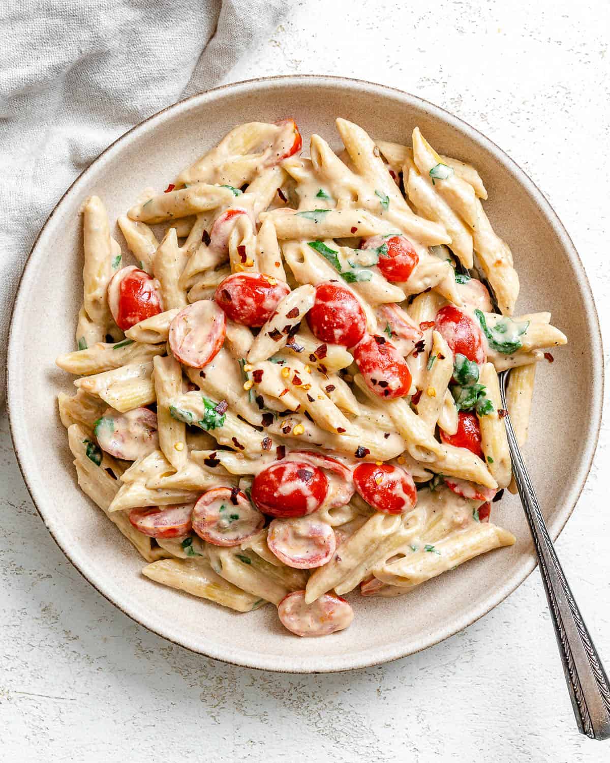 - Storage: This pasta can be stored in the fridge for up to 3 days. Reheat gently with a splash of water or plant-based milk to loosen the sauce.