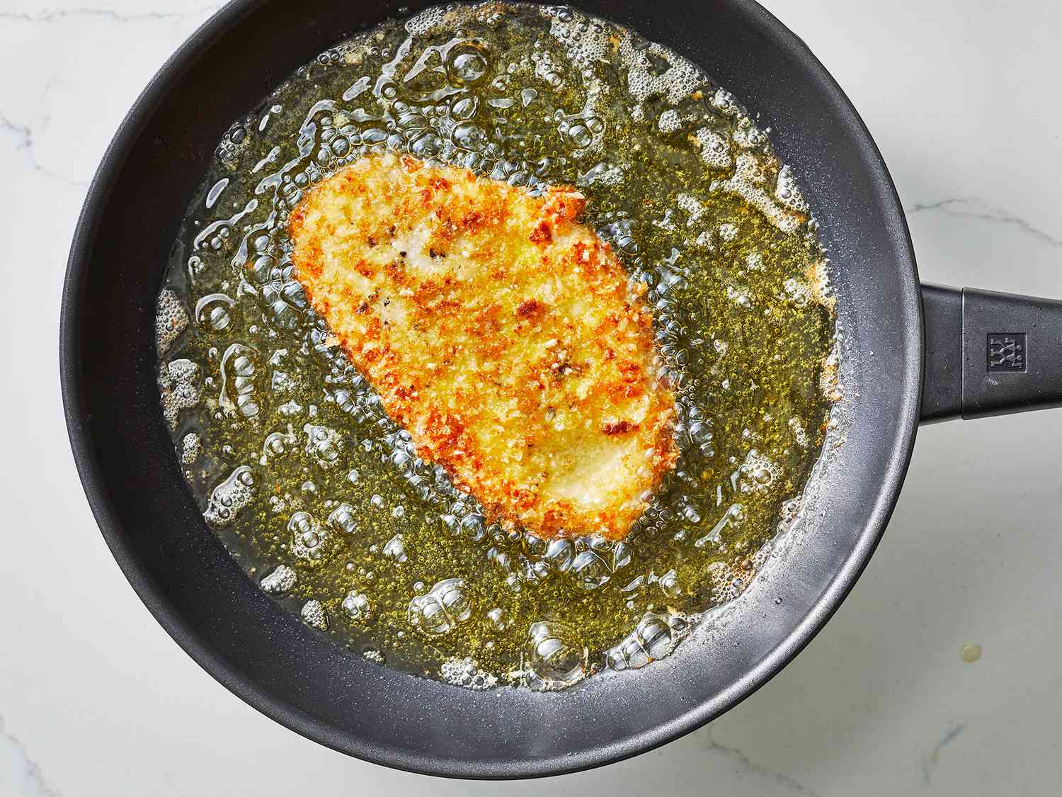 Bake if you like, but pan-frying in a thin layer of oil gives the chicken that golden, restaurant-style crunch.