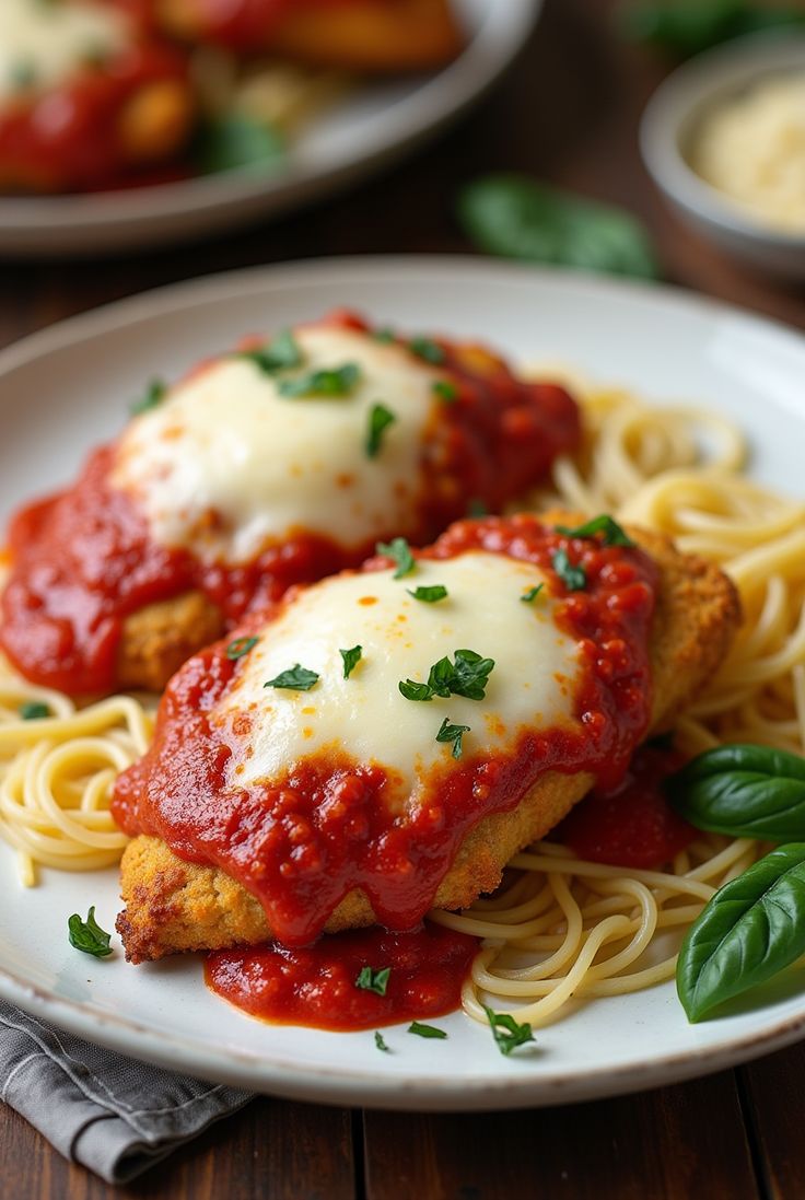 Chicken Parmesan pairs wonderfully with spaghetti or any pasta tossed in marinara sauce. For a lighter option, serve it with sautéed spinach, a crisp Caesar salad, or roasted vegetables. Garlic bread or toasted ciabatta on the side also makes the meal more hearty and satisfying.