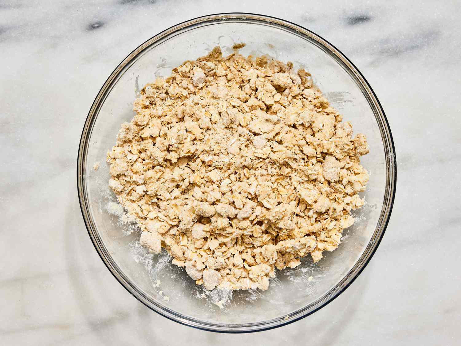 Overworking the dough can make the crust tough instead of tender. Combine the oat mixture just until the butter is incorporated and the mixture is crumbly. A food processor can help, but mixing by hand gives more control.