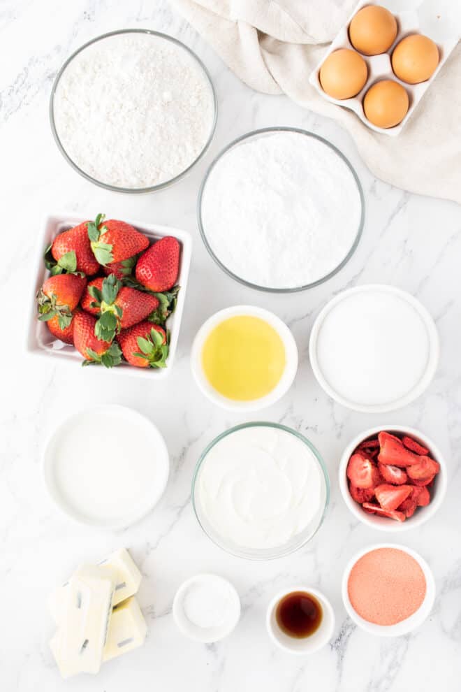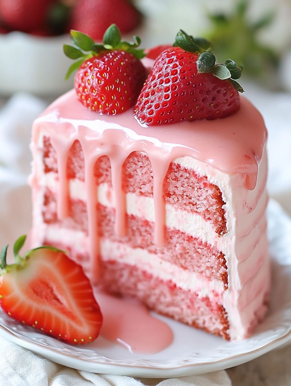 Topped with a creamy strawberry buttercream or whipped frosting, this cake delivers a burst of berry goodness in every bite.