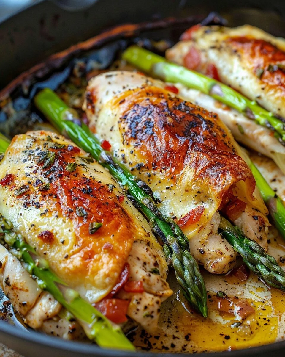Seasoned chicken breasts are cooked until golden brown, then topped with asparagus spears, melty cheese, and a hint of garlic butter for extra flavor.