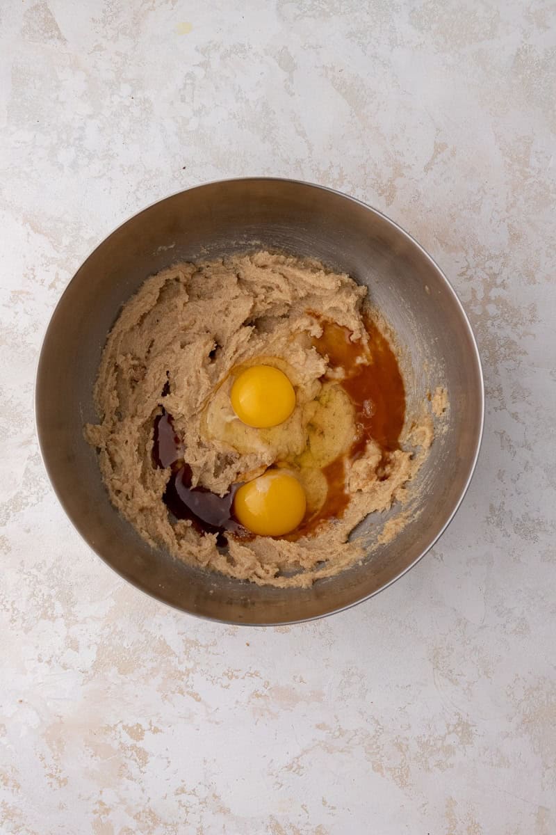 After adding the dry ingredients to the wet mixture, mix only until combined. Overmixing develops too much gluten, making the cookie chewy rather than soft and tender.
