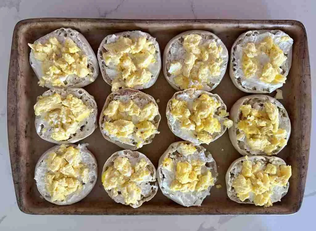 Place split English muffins on the baking sheet and lightly toast them in the oven for 5 minutes.