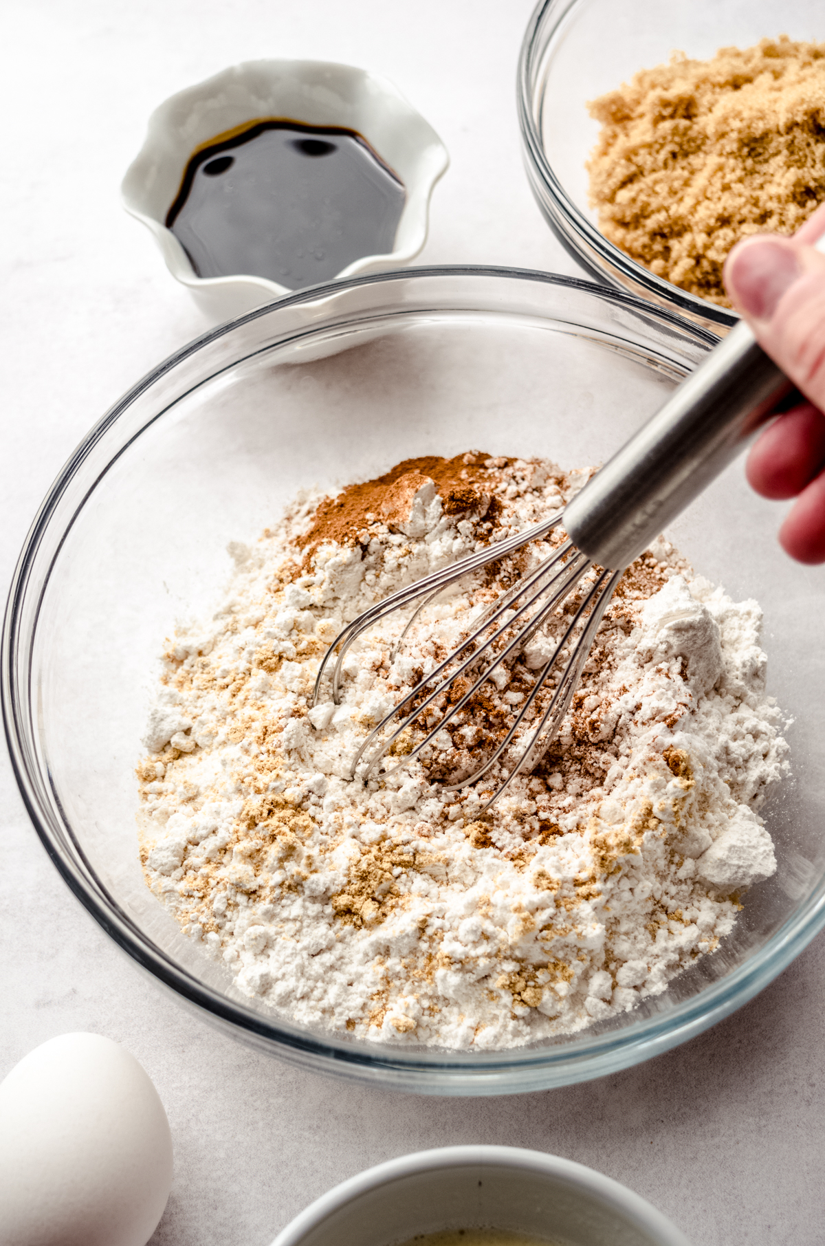 • In a medium mixing bowl, whisk together the flour, ginger, cinnamon, cloves, nutmeg, baking soda, and salt. Set aside.