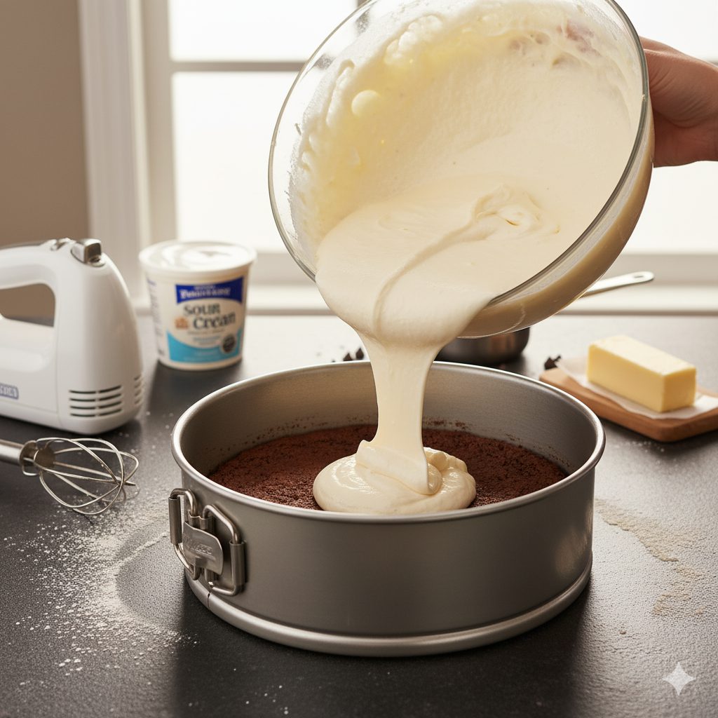 Pour the cheesecake batter over the baked brownie base. Smooth the top with a spatula. -