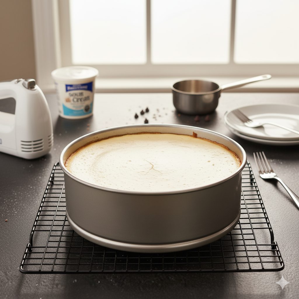Bake at 325°F (160°C) for 40–45 minutes, or until the center is almost set but still slightly jiggly. Turn off the oven, open the door slightly, and let the cheesecake cool inside for 1 hour. -