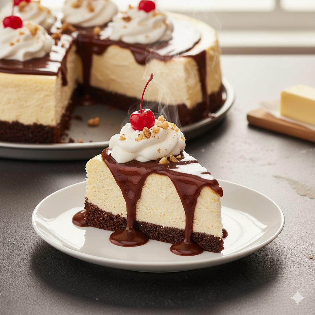 Imagine a fudgy brownie base, topped with creamy cheesecake, rich hot fudge, and a scoop of ice cream with whipped cream and cherries. That’s what this dessert is — a sundae turned into a decadent cheesecake. Every bite gives you the best of both worlds: gooey brownie and silky cheesecake together.