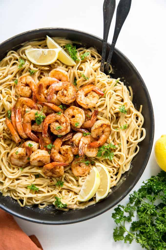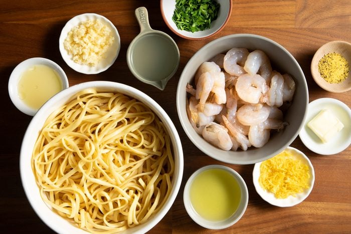 - This recipe easily scales. For every 2 servings, use about 6 oz of pasta, 1/2 lb of shrimp, 3–4 garlic cloves, juice and zest of 1 lemon, and 2 tablespoons of olive oil or butter.