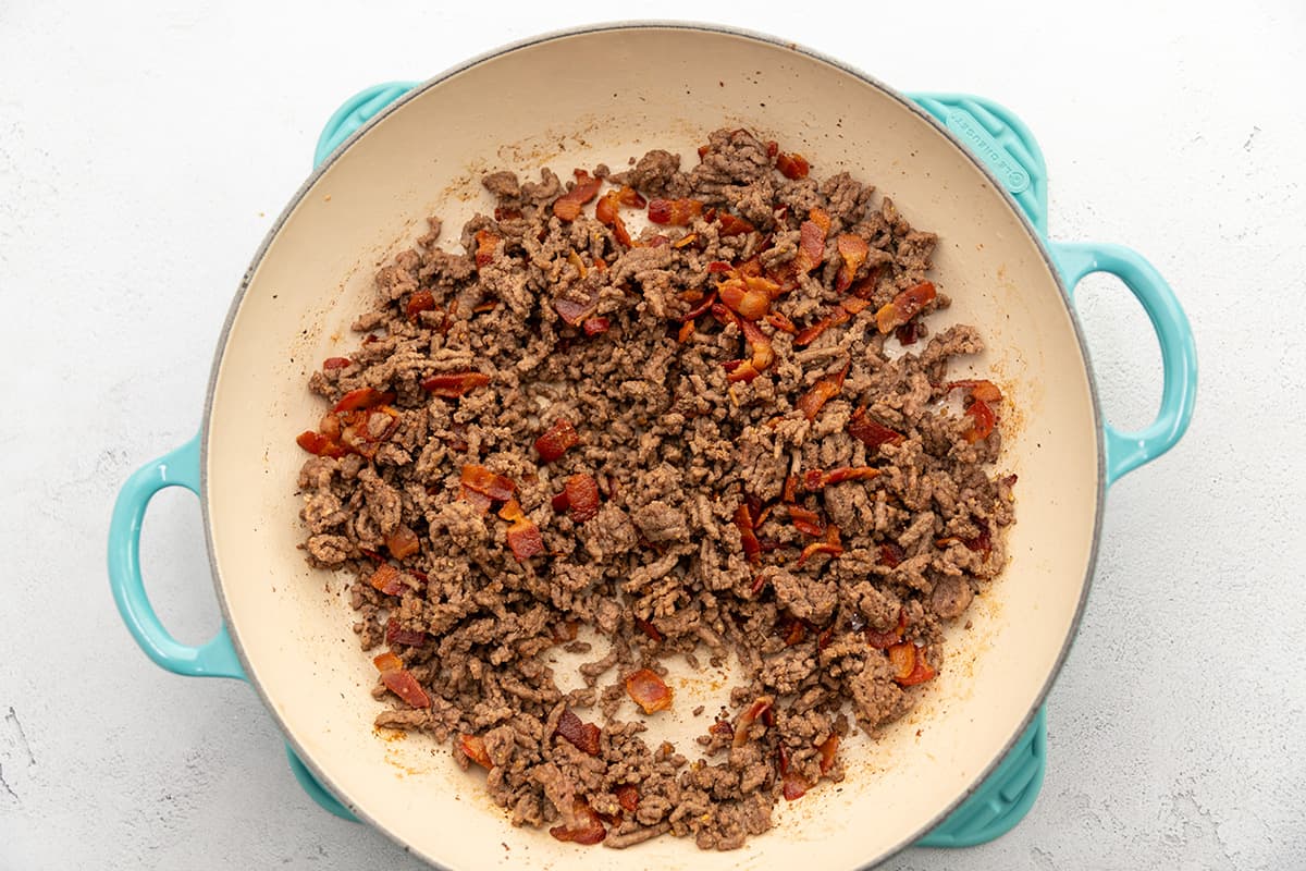 Cooking bacon in the oven or air fryer keeps it crispy and avoids sogginess in the casserole. Crumble and sprinkle it over the top or mix it into the beef mixture just before baking.