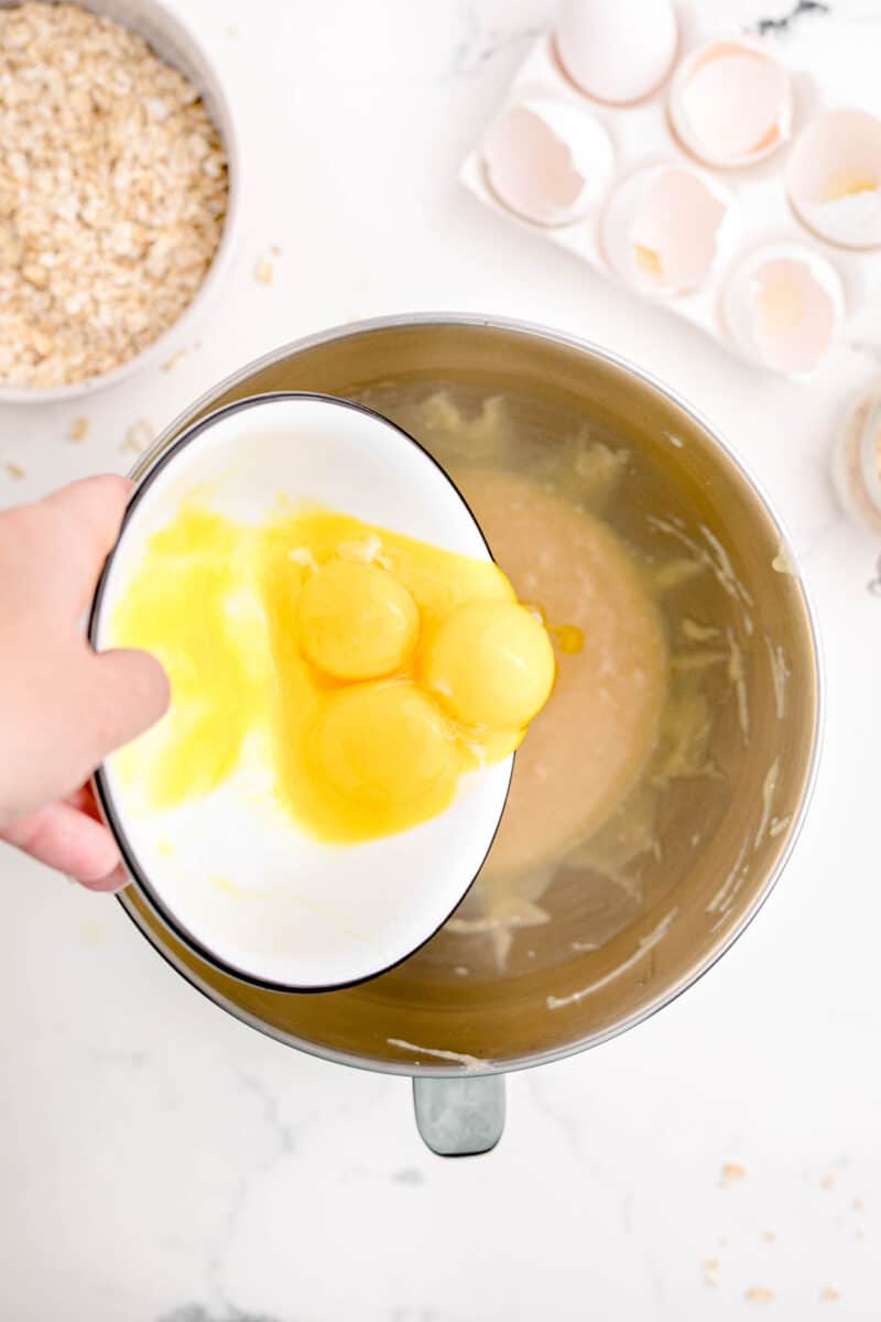 The foundation of this pie begins not with a standard pie crust, but with a chewy oat cookie that will later be crumbled into a crust. Preheat your oven to 350°F (175°C). In a medium bowl, cream together the softened butter, brown sugar, and granulated sugar until fluffy. Add in the egg yolk and beat until smooth. In a separate bowl, whisk together the flour, oats, baking powder, baking soda, and salt.