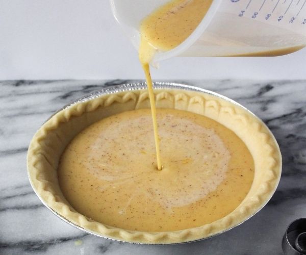 Pour the custard mixture into the prepared pie crust. Make sure it’s evenly distributed. Tap the pan gently on the counter to release any air bubbles and ensure a smooth surface.
